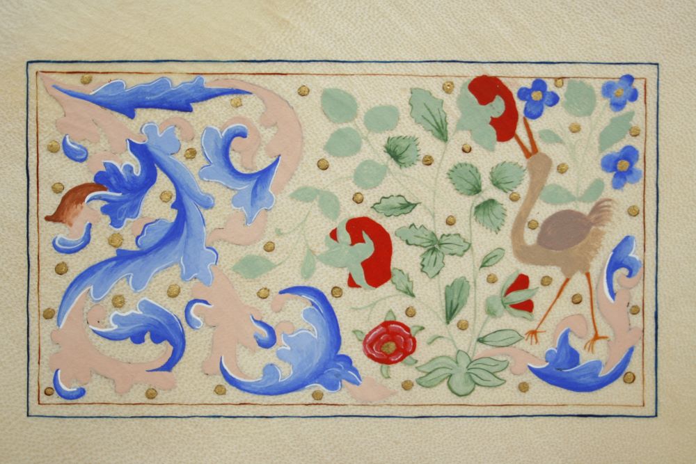Pour les enluminure, j’utilise aussi du parchemin. La texture imperméable empêche les encres de pénétré en profondeur comme elles le feraient avec du papier. Ainsi, l’éclat et la densité de la lumière des pigment est conservé. Le résultat est incomparable. C’est un matériel durable dans le temps. Il existe différentes qualités de parchemin issue de différents animaux (chèvre, mouton, veau).
